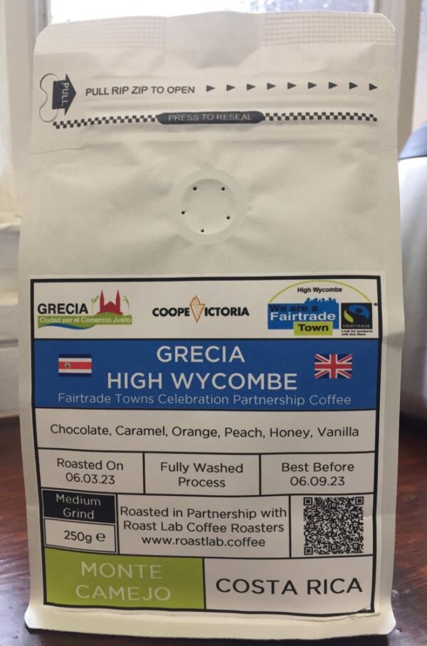 Grecia, marzo 2023. Como parte de la alianza comercial gracias a la hermandad entre las ciudades Comercio Justo Grecia – High Wycombe, este lunes 03 de marzo en la ciudad de High Wycombe, Reino Unido, se realizó el lanzamiento de una edición especial de Café Monte Camejo de CoopeVictoria, R.L.